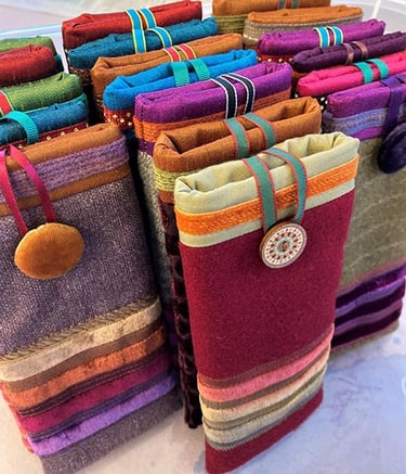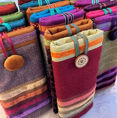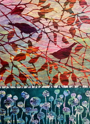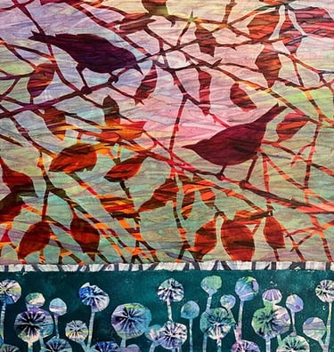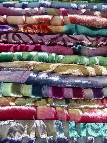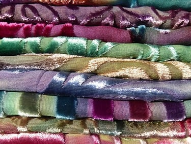 Growing up on a farm and having a textile trained art teacher at school were both formative influences on my development as a Textile Artist / Designer. Learning many aspects of textile design and manipulation at degree level, I have continued to work for many years using a combination of hand painting and printing techniques, predominantly using velvet as my ‘canvas’ to produce scarves and accessories which are sold throughout the country in museums, galleries and craft outlets. I use the recurring themes of colour, pattern, light, rhythms and silhouettes of our natural environment and enjoy the layering and depth that experimenting with devoré (etched) velvet can demonstrate.
